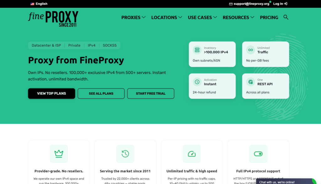 Key features: Private datacenter proxies, unlimited traffic, dedicated plans, anonymous IP positioning. Accurate datFineProxy’s search listings say datacenter IPs start at $0.07, dedicated proxies start at $2.00 per IP, and its public private proxy plan example shows 1 USA IP for $6 per month with unlimited bandwidth. Pros: Unlimited traffic, clear dedicated-use positioning, solid for buyers comparing low-cost private datacenter plans. Cons: Public examples suggest pricing varies a lot by location and plan type, so buyers need to compare carefully before scaling.