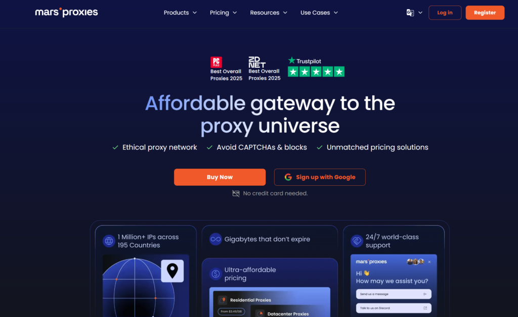 MarsProxies is a practical budget pick for users who want cheap private proxies without getting locked into only one proxy type. Third-party pricing pages describing MarsProxies list private proxies at $2.49 per month for one IP, residential traffic from $4.99 per GB, and datacenter proxies from around $0.99 per proxy. That gives it a useful middle-ground position for smaller teams that want private IPs for account work but may also need residential traffic for tougher targets later.