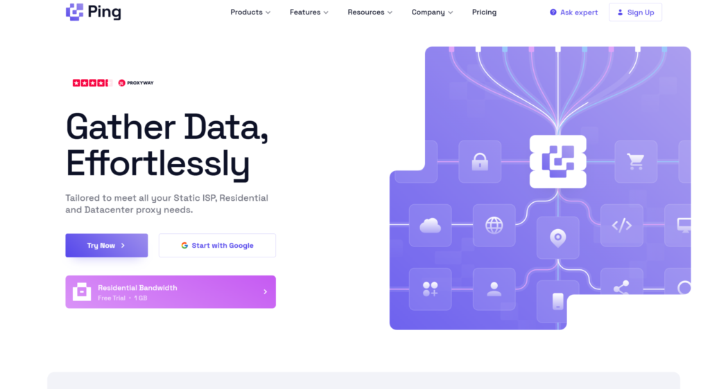 Ping Proxies provides Iraq residential and datacenter infrastructure with 50,384 monthly active IPs, 99.97% uptime, unlimited bandwidth, and speeds exceeding 1 Gbps. The service guides users through proxy type selection based on speed, authenticity, or anonymity priorities.
