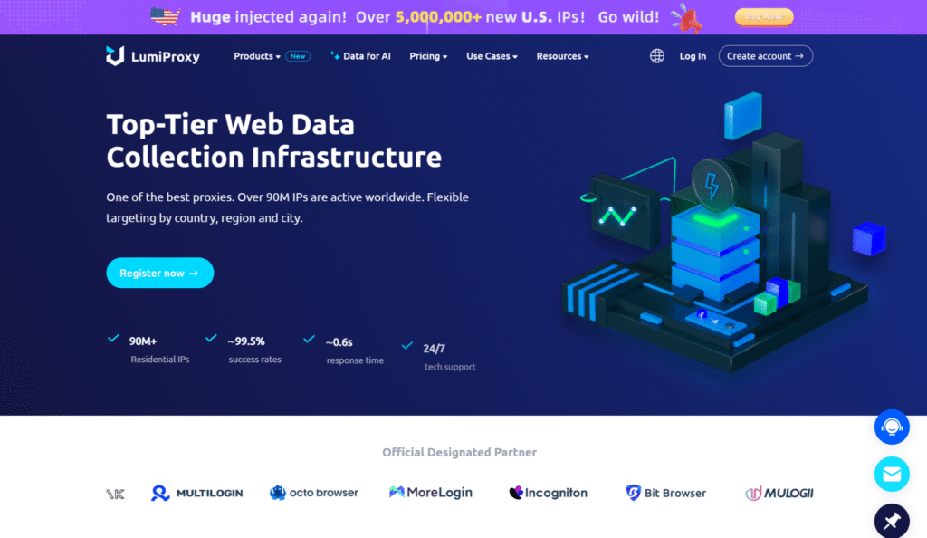 • Rotating Residential Proxies: Harness the power of 10M+ ethically-sourced IPs across 180+ countries. These proxies rotate dynamically to bypass IP blocks, CAPTCHAs, and delivering 99.9% uptime and precise targeting at the country, city, or ZIP code level.