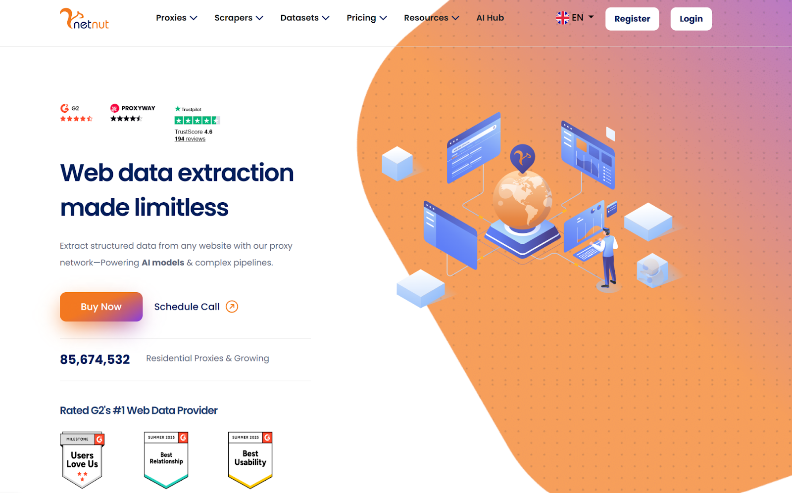 NetNut specializes in 85 million+ ISP-derived residential proxies from 195+ countries, blending datacenter speeds with residential legitimacy through direct ISP routing. The service provides unlimited bandwidth on many plans with 99.99% uptime.