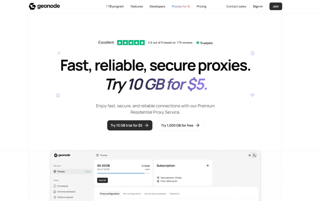 - Key features: 32M+ IPs, country/state/city targeting, unlimited sessions, 7-day sticky IPs, no traffic expiration