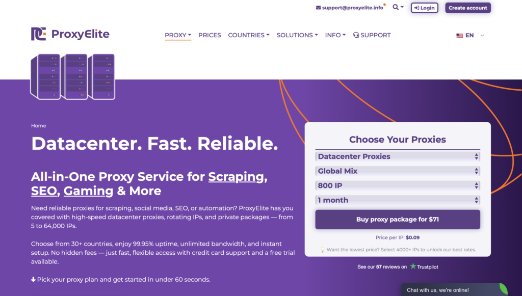 - Accurate data and information: Network exceeding 100,000 IPs with millions of private proxies available globally, 99.9 percent uptime for datacenter options, bandwidth over 100 Mb/s, 24/7 customer support with rapid response times.