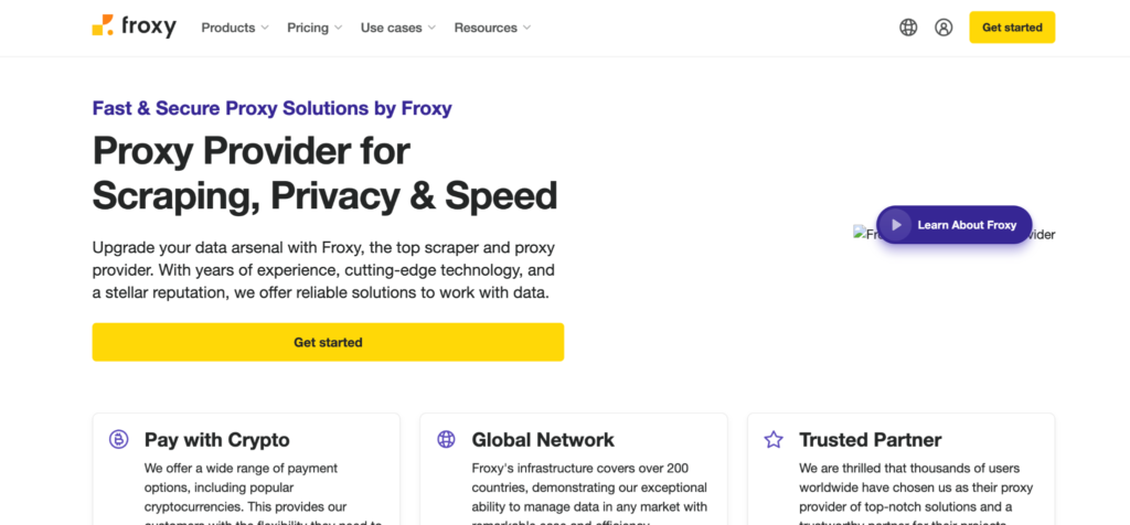 • Key Features: Large proxy pool, supports HTTP(S), SOCKS5, rotating and sticky sessions