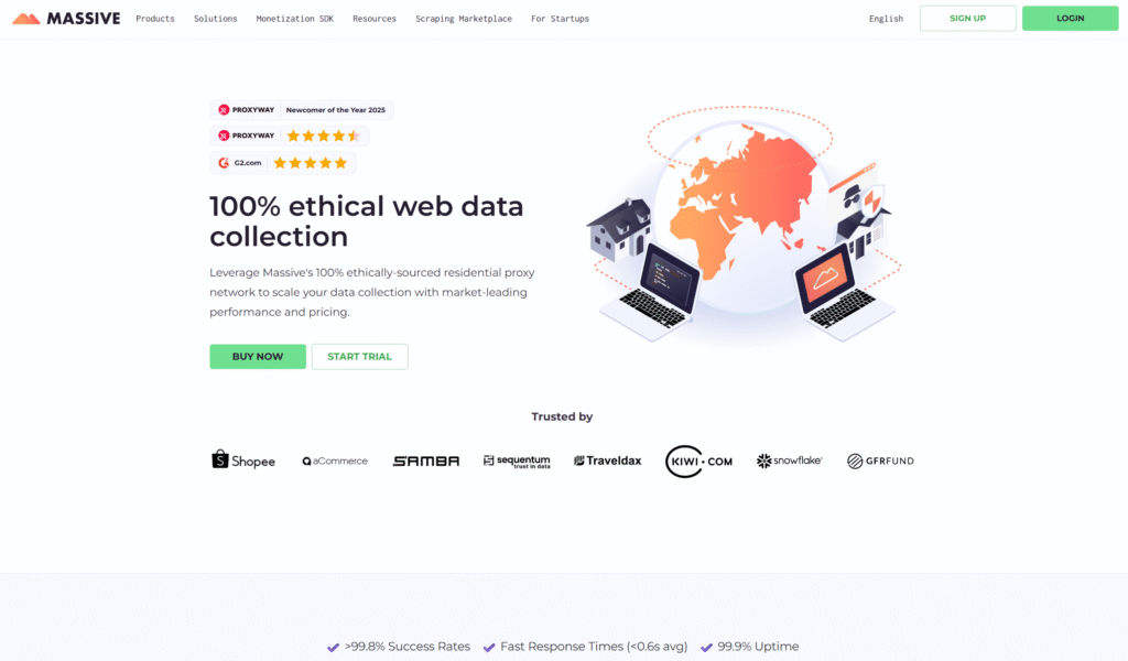Massive is a newer residential proxy provider with an undisclosed but average-sized pool that delivers strong performance across key gambling markets in the US and Europe. It sources proxies through an SDK and offers unique device-targeting options, including computer, phone, and smart TV, which can help simulate authentic player profiles when testing mobile casino apps and responsive sites. Massive achieved a 99.66% success rate in recent tests with 0.92s average response time, making it competitive on reliability despite a smaller global footprint. The provider enforces a strict family-friendly content policy, so teams should confirm use-case compatibility, but for standard iGaming QA, competitive research, and data collection, Massive offers a solid balance of features and performance.