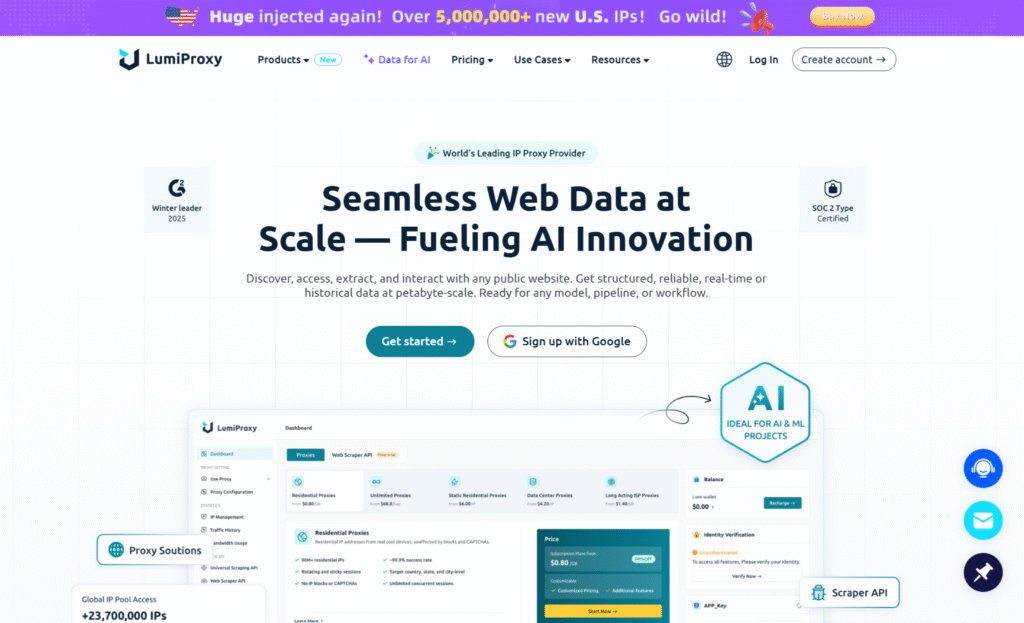 Oxylabs operates a massive network of 100 million+ residential IPs covering 195+ countries including Saint Lucia. From their headquarters in Vilnius, Lithuania, they focus on enterprise-level solutions with advanced rotation technology to bypass CAPTCHAs and geo-blocks. The platform includes scraper APIs, unblocker tools, and datacenter options for faster simple tasks.