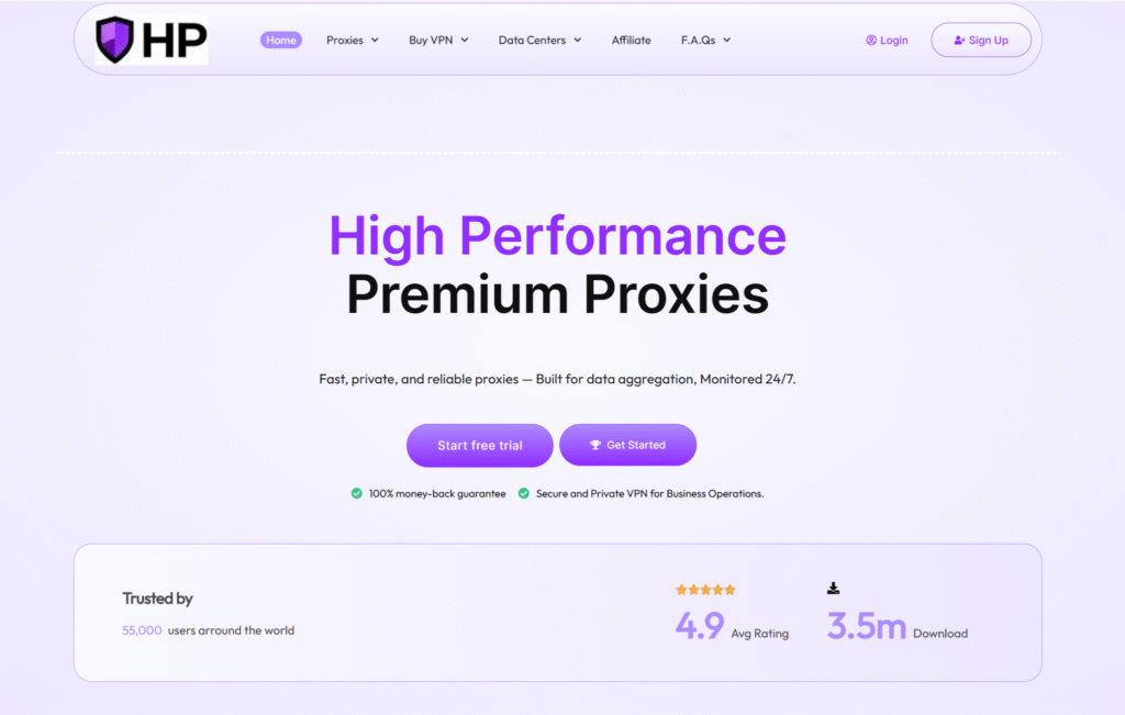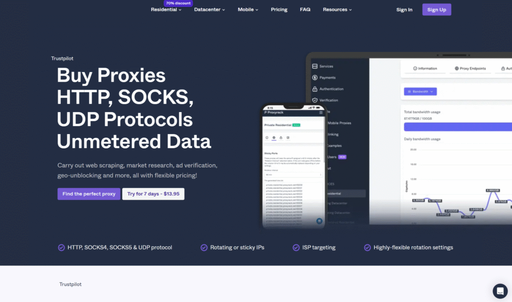 • Rotating Mobile Proxies: Powered by 4G/LTE/5G networks, our mobile proxies offer lightning-fast speeds with <0.3s response times and a 99.9% success rate perfect for real-time applications.