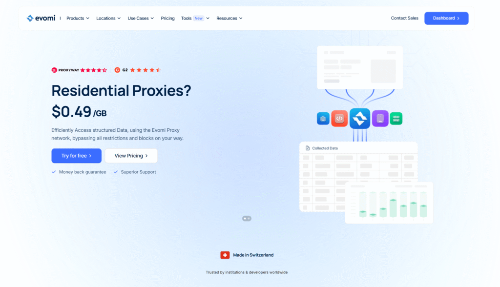 Evomi provides sessions up to 120 minutes with minimum IP uptime guarantees and dedicated IP upgrade options. Their static proxy sessions maintain stability for extended operations. Swiss-based infrastructure emphasizes privacy and data protection standards.